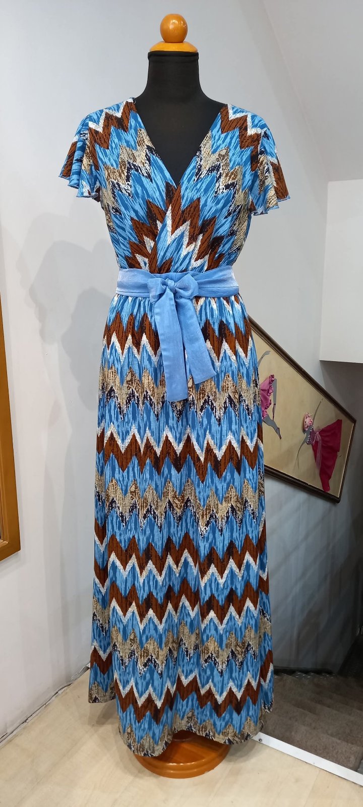 - Ζώνη: Δένεται στη μέση με υφασμάτινη ζώνη στο χρώμα του μπλε, αναδεικνύοντας τη σιλουέτα και προσδίδοντας κομψότητα.